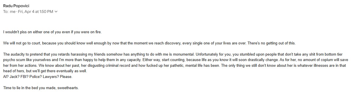 Radu is still trying to punish me, because I no longer care about him and have moved on with my life. I do not contact him, other than one email in 3 months with a GIF of Vanessa Monet and and a single emoji mocking his ex girlfriend Voiceslut69, who now does porn. Other than that, I have no interest in him. I write about my experience with the person who verbally abused me who encouraged me take my own life because he wouldn’t stop repeatedly telling me that I was worthless and that I should kill myself.