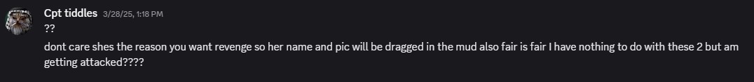 My nephew is a child who loves soccer and his toys, he shouldn’t be involved in some sick revenge plot that my ex cooked up to hurt me. I am currently dating someone in law enforcement, who I care very much about, I wouldn’t jeopardize his career or my peace to harass some random no life gaming idiot calling himself “Cpt tiddles”.