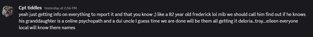 Cpt tiddles also ran a background check on me to harass me with the mistake I made as a teen. He’s looking into my background with the sole purpose of cyberstalking and harassing me, my nephew and the teenage sister of my best friend.